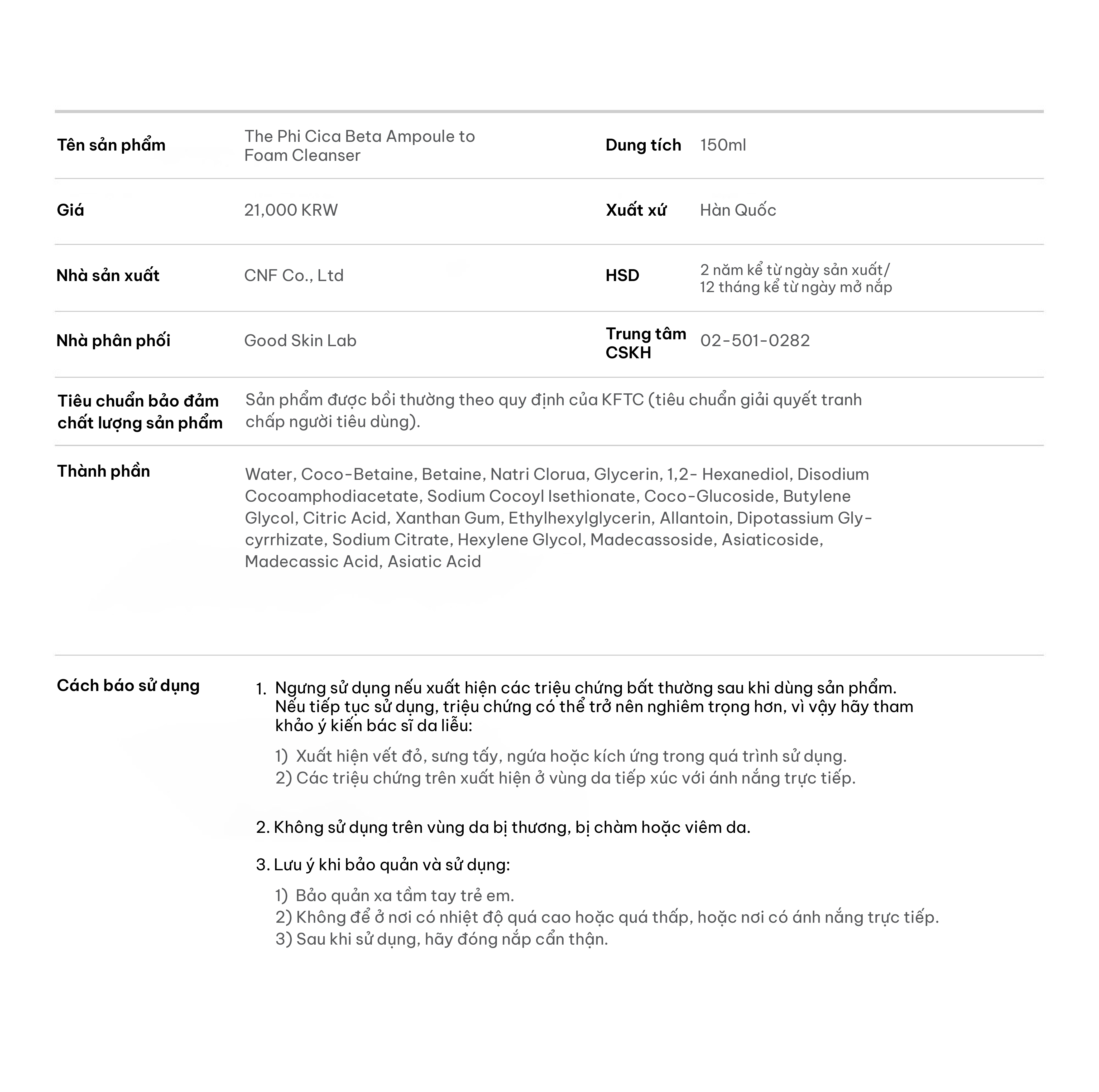 Sữa rửa mặt tạo bọt Ampoule Cica Beta The Phi